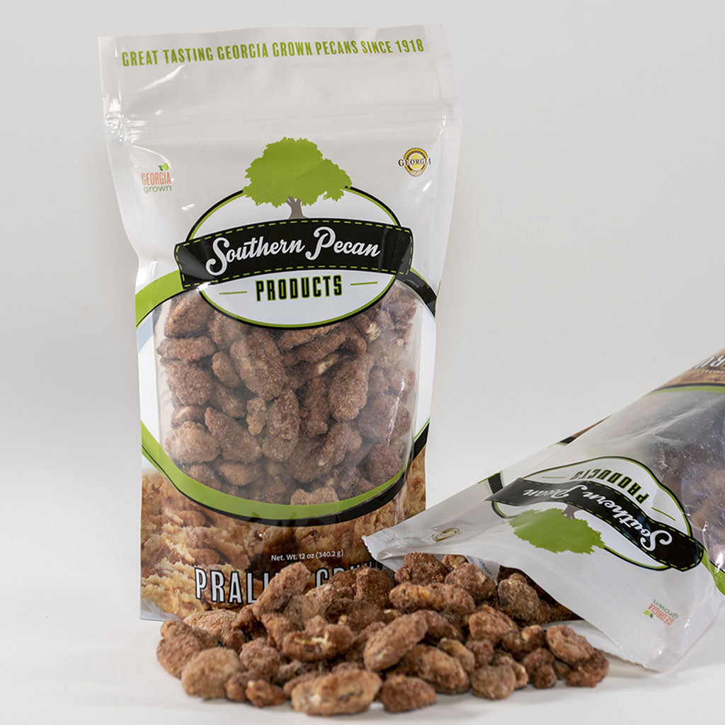 These pecans are coated with sugar, butter, and corn, syrup for a crunchy taste of praline.